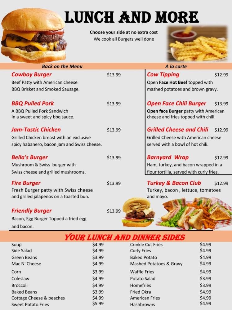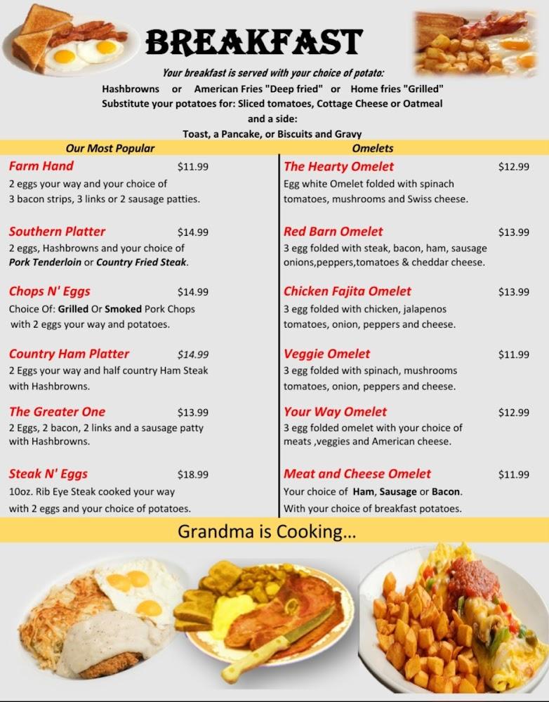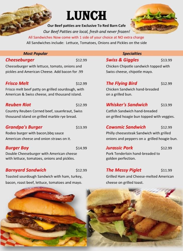 Red Barn Cafe serves an extensive menu. Breakfast ranges from omelets to pancakes, catering to every appetite. Standout dishes showcase home cooking with a twist, such as Chicken N' Waffles and Creative Skillets.