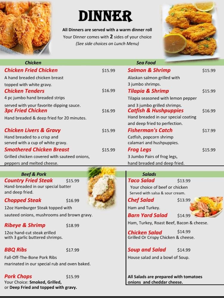 Lunch and dinner offer local favorites like BBQ Ribs and Catfish. Appetizers feature crispy hand-breaded mushrooms. The price range is budget-friendly, making it accessible for all. Portions are generous, ensuring satisfaction with every meal.
